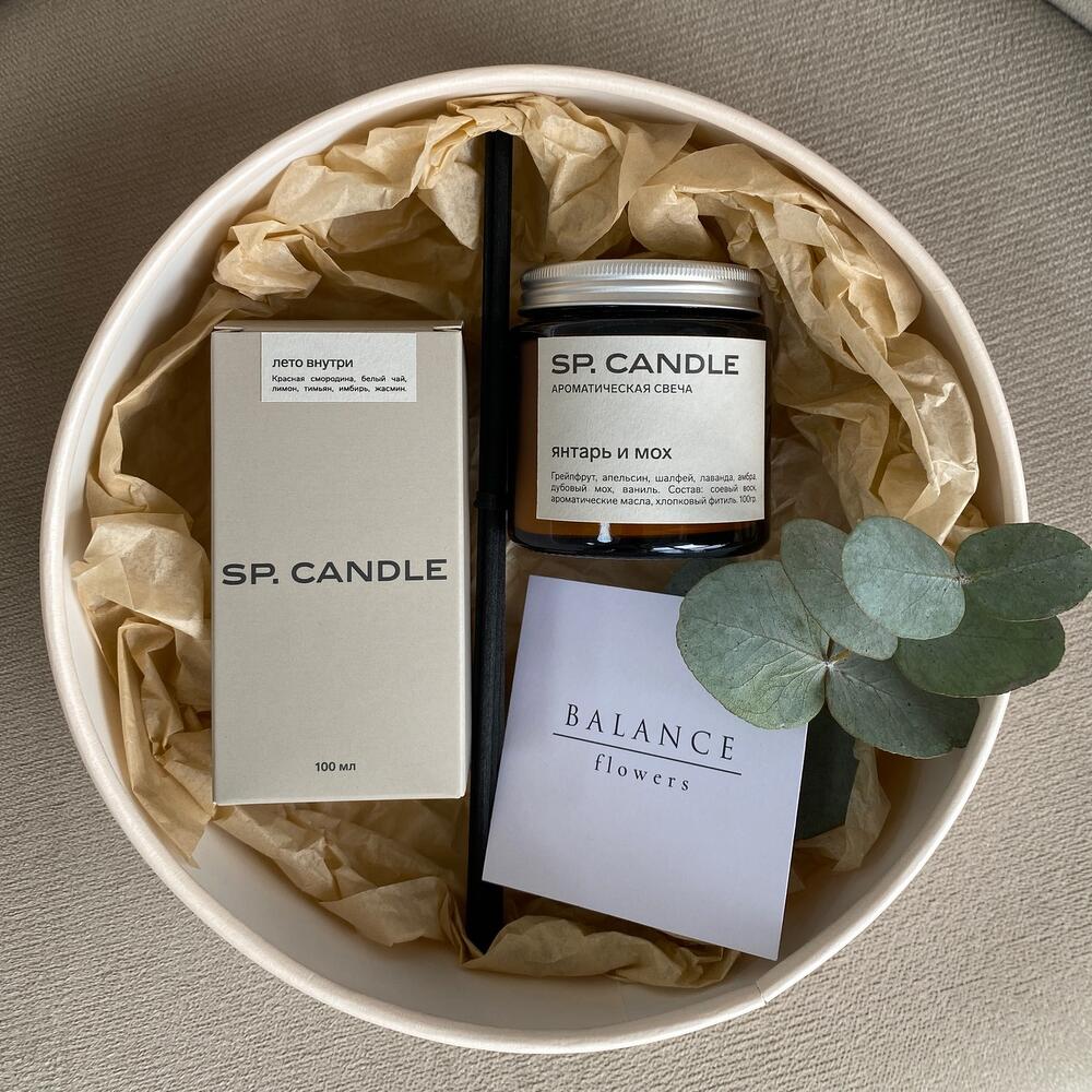 Подарочная коробка со стильной аромасвечой из натурального соевого воска «Янтарь и мох» 100 г и диффузором «Лето внутри» 100 мл.