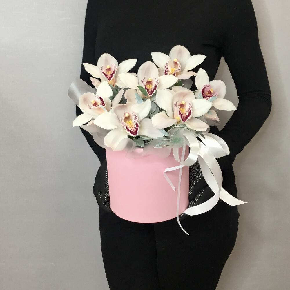 Эвкалипт - 3 шт. Лента атласная - 1 шт. Коробка шляпная - 1 шт. Оазис флористический - 1 шт. Цимбидиум белый - 7 шт.